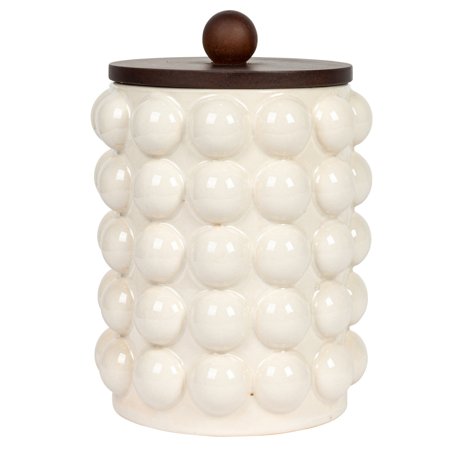 Catalog Name: 5-3/4" Round x 8-1/4"H Stoneware Canister w/ Raised Dots & Acacia Wood Lid, Crackle Glaze, White & Natural (Each One Will Vary)