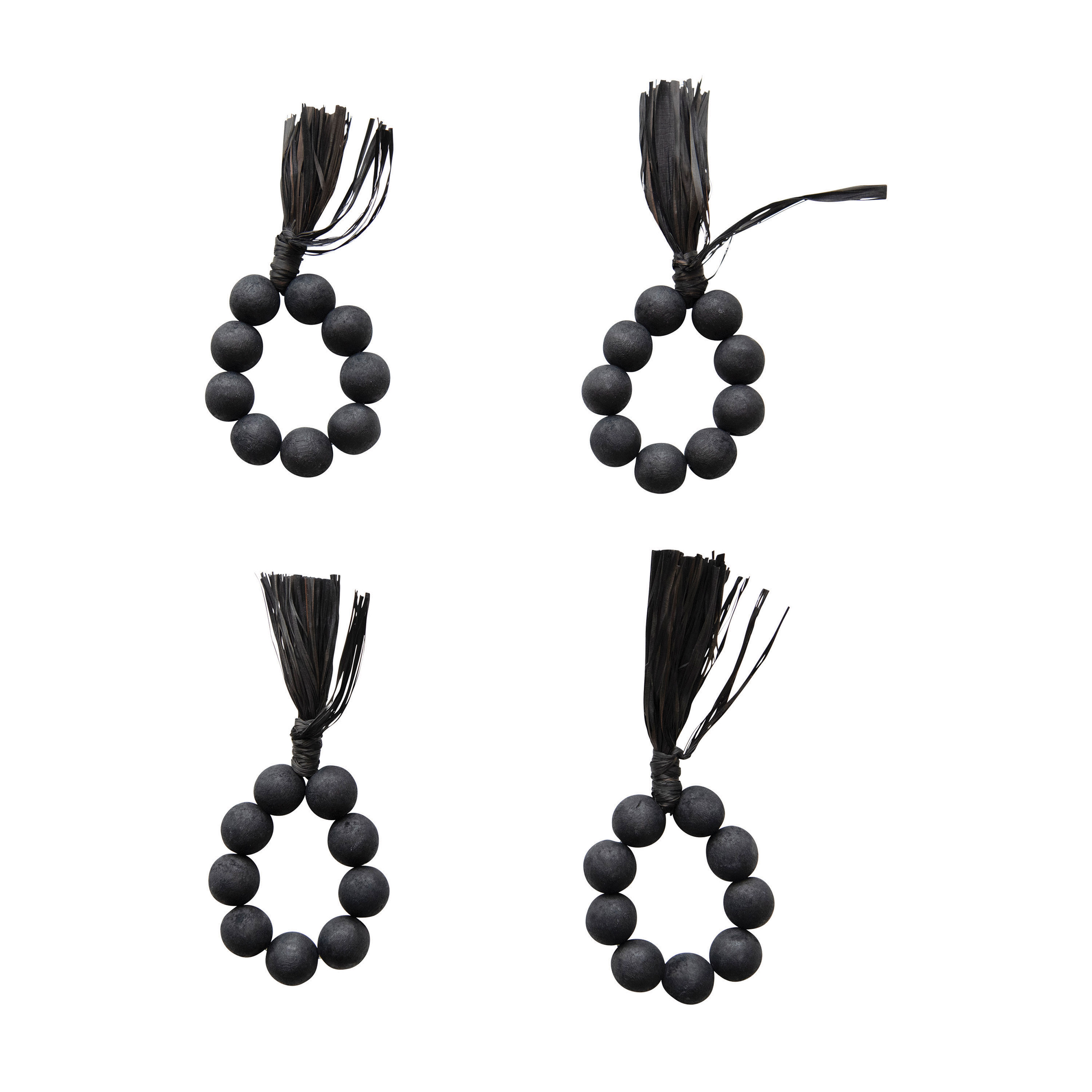 Catalog Name: 2-1/4" Round Wood Bead Napkin Rings w/ Raffia Tassel, Black, Set of 4