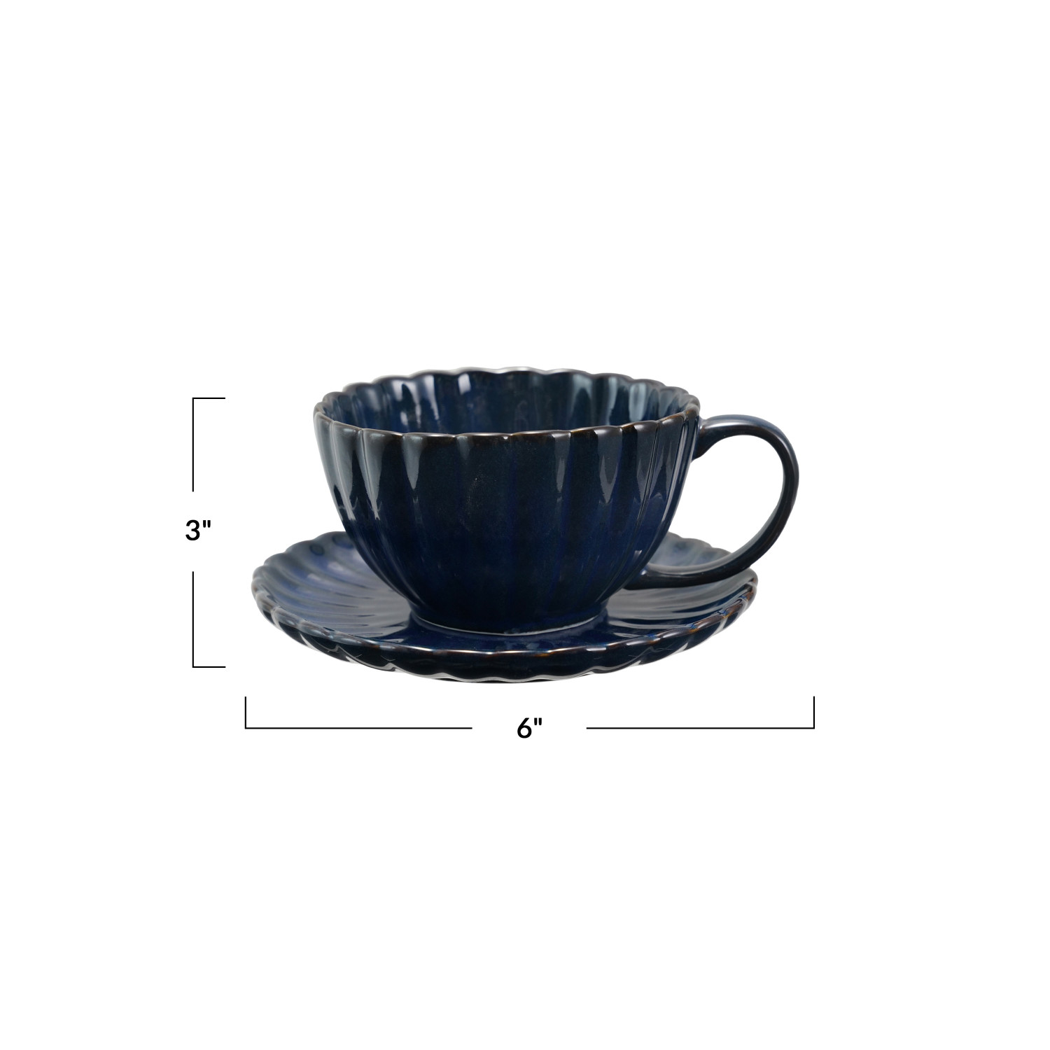 Catalog Name: 6" Round x 3"H 10 oz. Stoneware Ribbed Mug w/ Saucer, Reactive Glaze, Blue, Set of 2 (Each One Will Vary)