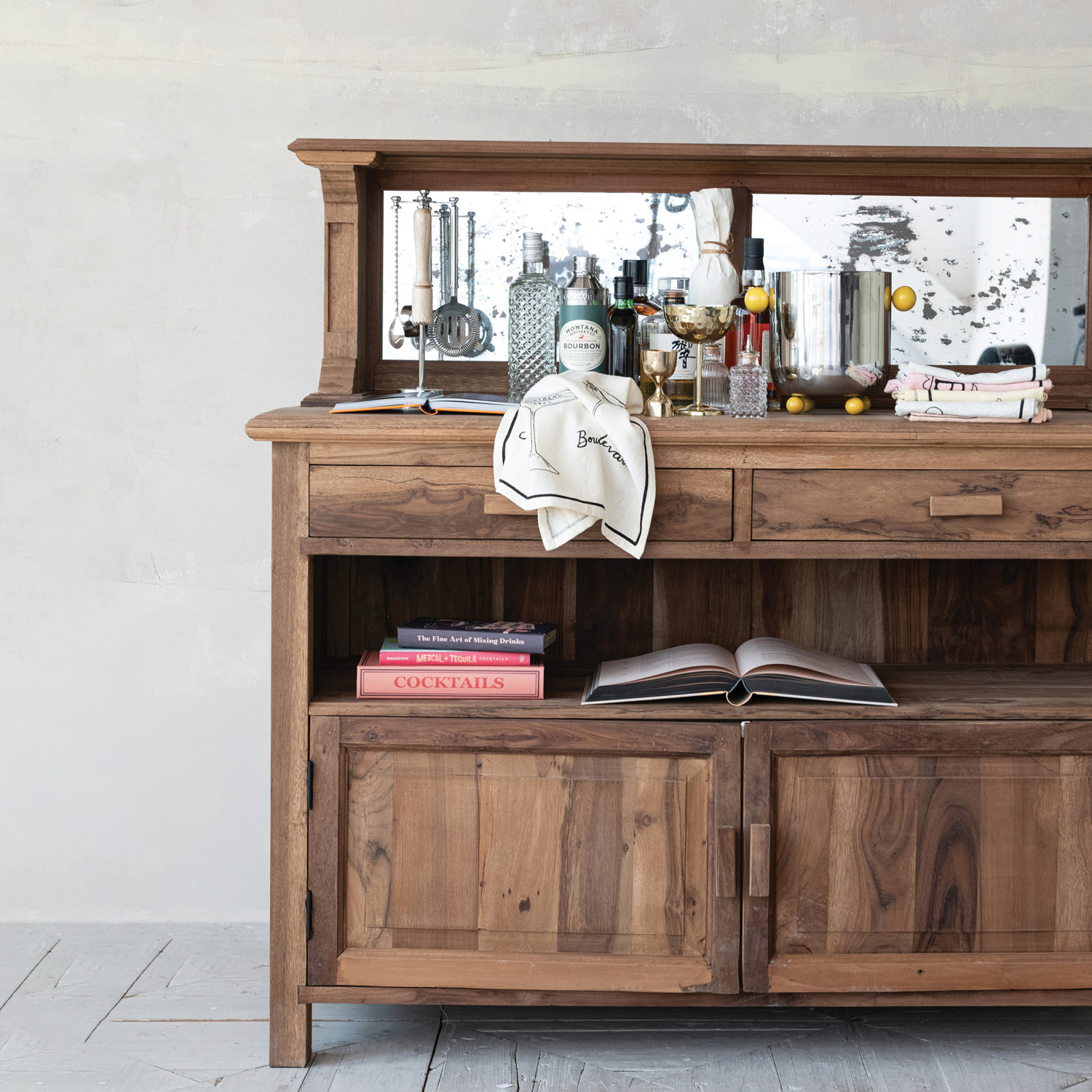 Catalog Name: 54"W x 22"D x 52"H Reclaimed Wood Vintage Reproduction Sideboard w/ Antique Mirrored Back, 2 Doors, 2 Drawers & 1 Shelf, Natural, Truck Ship