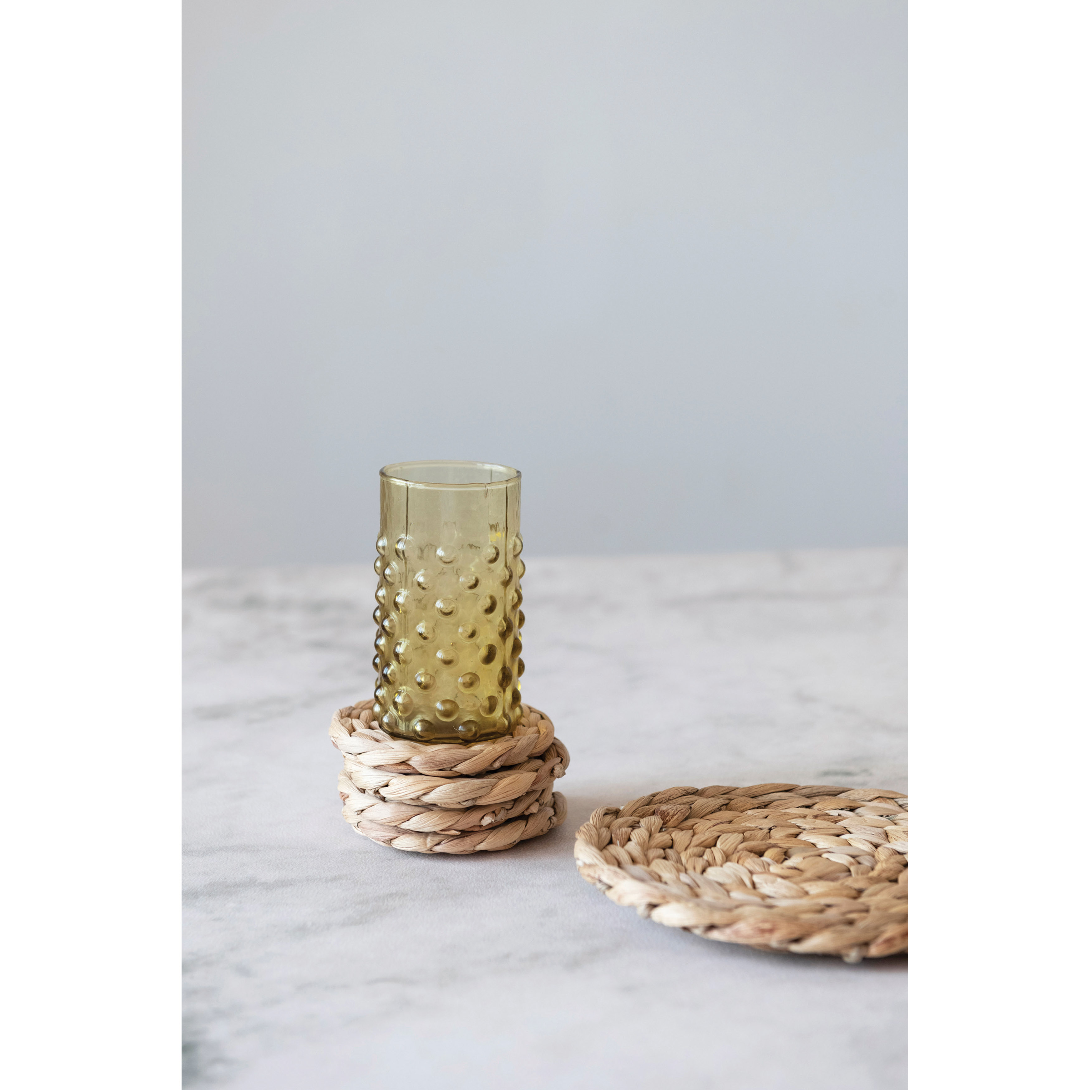 Hand-woven water hyacinth trivet and 4 coasters in a natural finish. Create a stunning tablescape with these artfully crafted coasters. Made from 100% water hyacinth. Curate a space that reflects your unique sense of style with intentionally designed home décor.