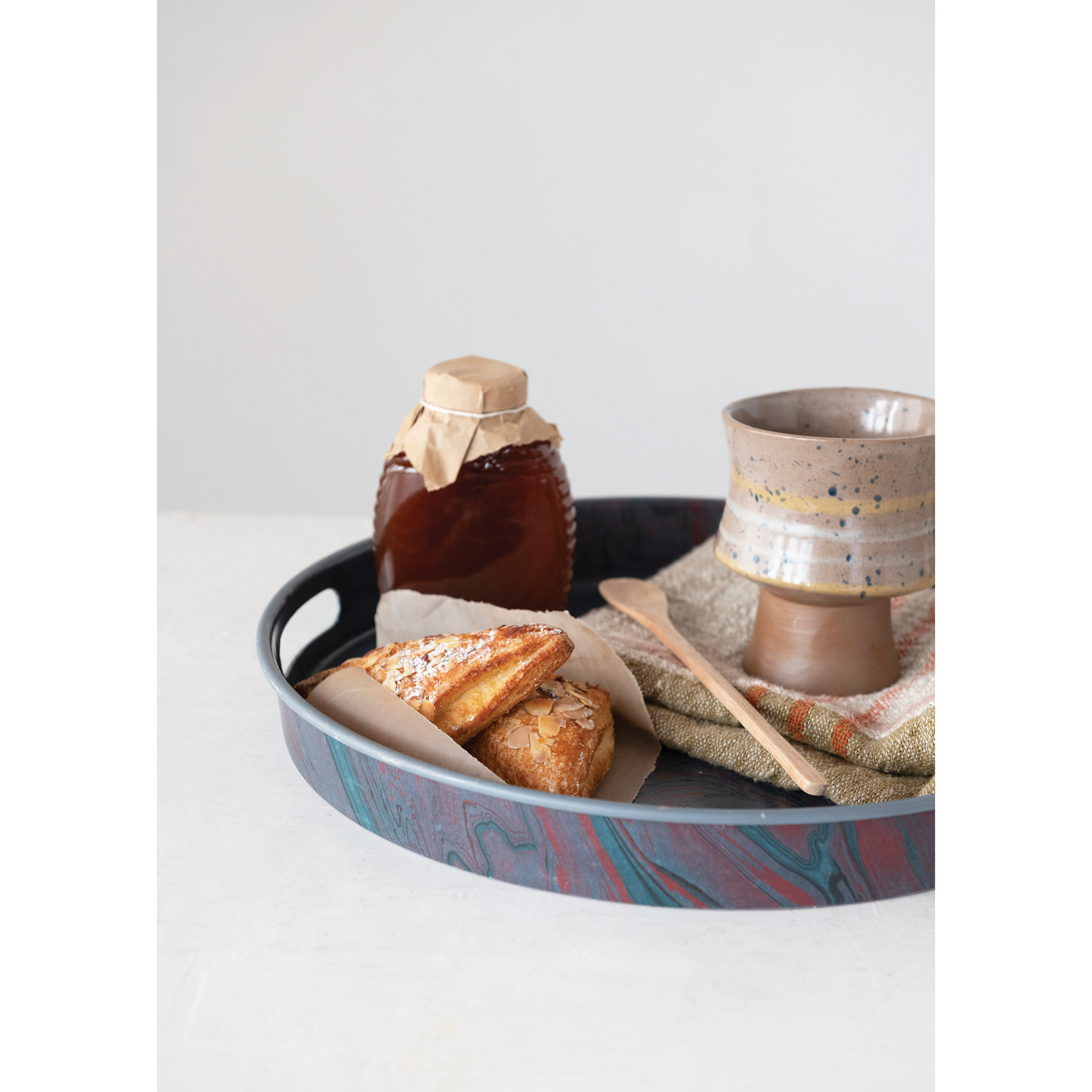 Catalog Name: 15-1/4" Round Decorative Enameled Metal Tray w/ Marbled Pattern & Handles, Multi Color ©