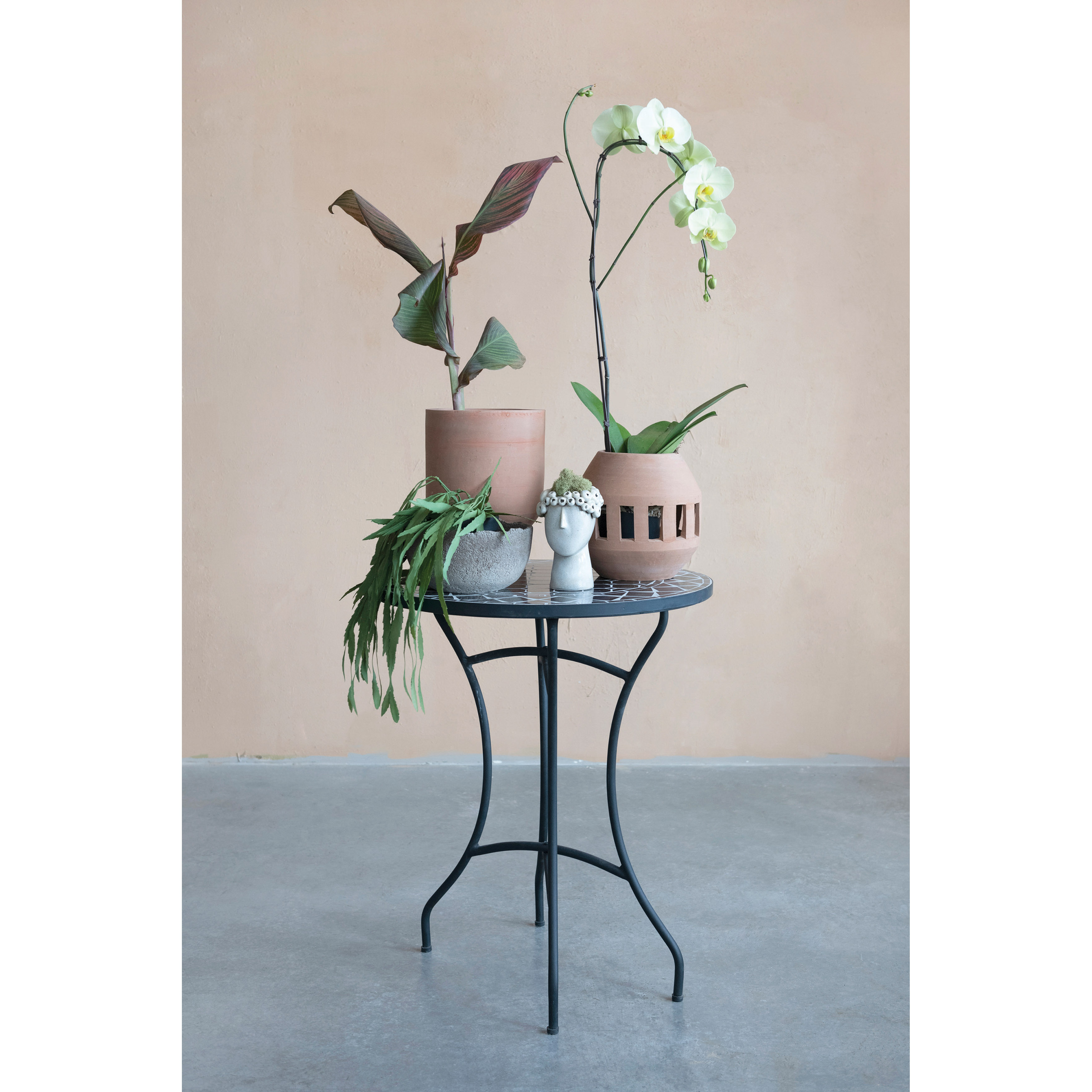 This contemporary terracotta planter features a modern, peekaboo silhouette with hand-carved windows. Round terracotta planter with cutouts in a natural finish. Add a touch of natural beauty to any covered patio or living space with this artistically crafted planter. Made from 100% terracotta.