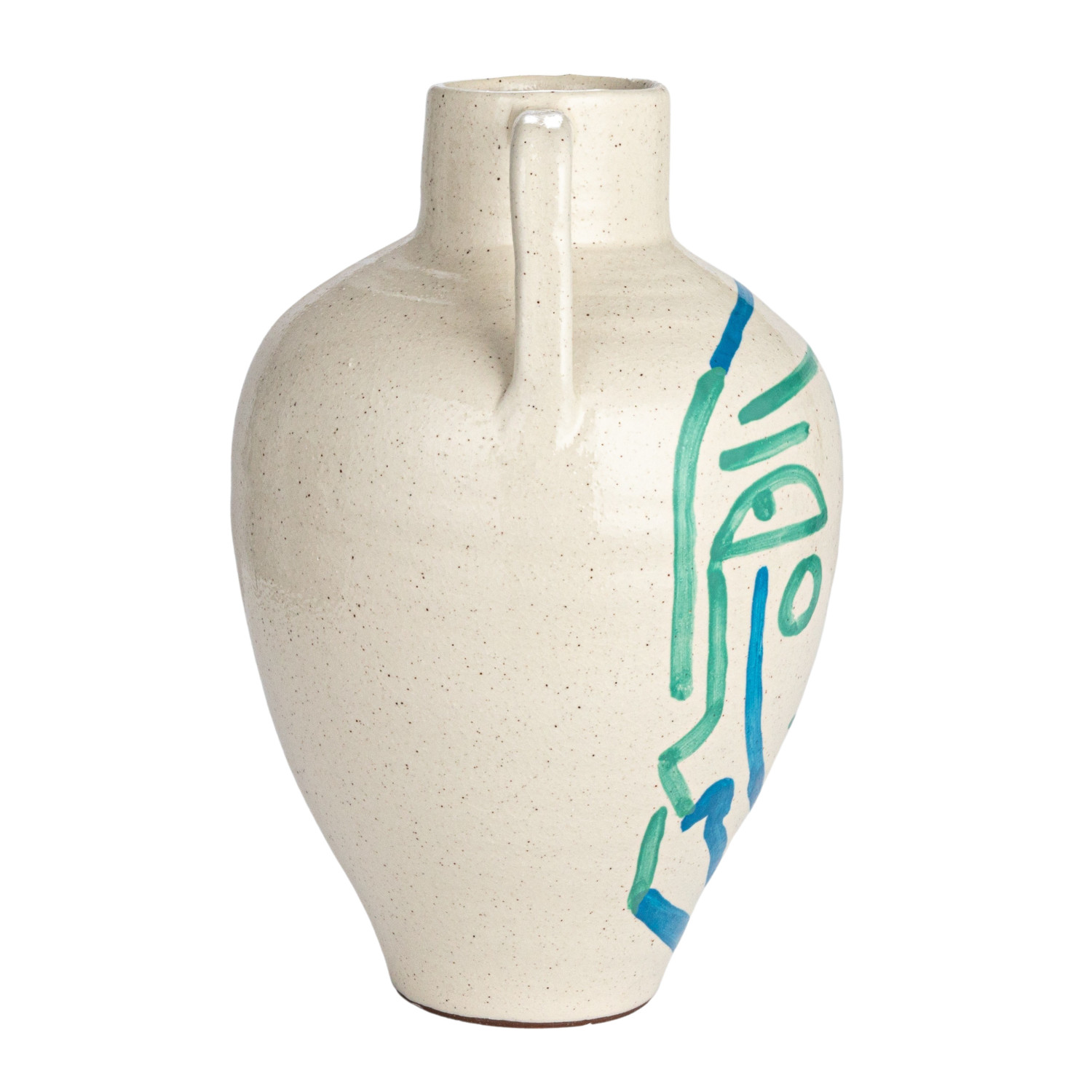 This hand-painted terra-cotta vase features an abstract face and crackle glaze in white, blue, and aqua colors. It is a unique and beautiful home accessory, made of baked clay with a porous and earthy texture. The vase has a round shape and wide opening, and its hand-painted design adds a playful and artistic touch. The crackle glaze creates a glossy surface, while the white, blue, and aqua color scheme adds a cozy and elegant look. This vase can be used to display fresh or artificial flowers, plants, or branches, or as a sculptural accent. Place it on tables, shelves, mantels, or windowsills, and create a cozy and inviting atmosphere in the home. It is suitable for farmhouse, coastal, French country, cottagecore, or boho style and adds personality and charm to any space. Truck shipping is required due to its size and weight.