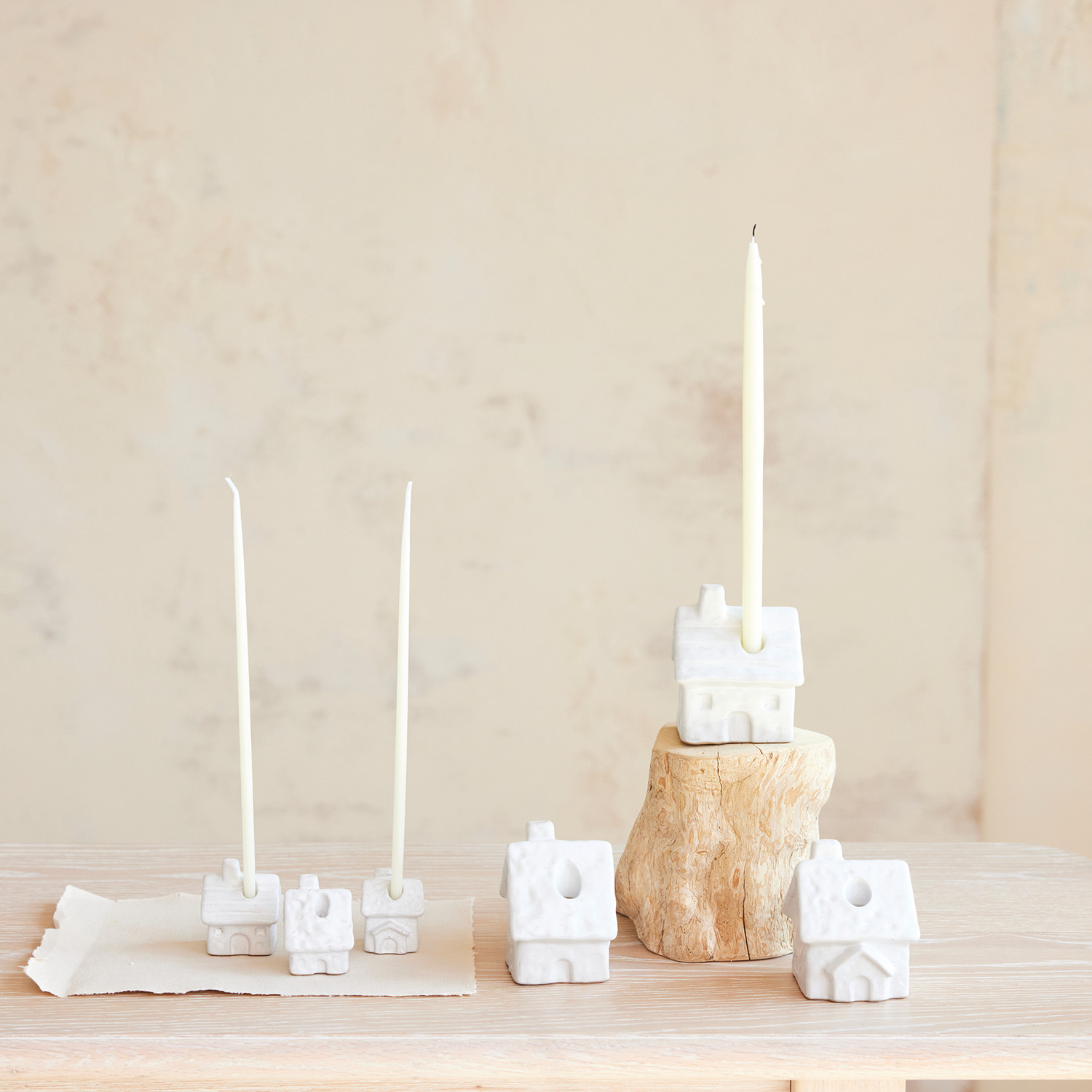 Catalog Name: 1-1/2" Square x 2"H Stoneware House Shaped Taper Holder, Reactive Glaze, White, 3 Styles (Holds 1/4" Taper) (Each One Will Vary)
