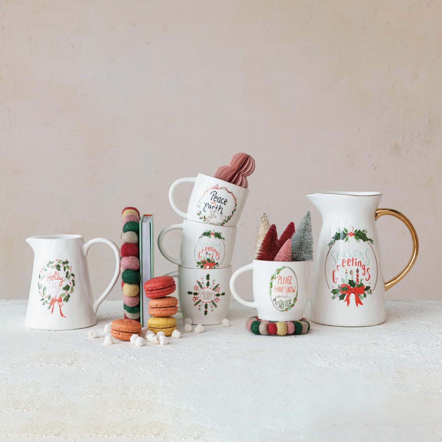 This "Holly Jolly" stoneware pitcher, adorned with gold electroplating, is a merry addition to the holiday decor. Its vibrant colors and festive inscription are complemented by the luxurious touch of gold, making it a dazzling piece for any celebration. The pitcher measures 6.5 inches in length, 5 inches in width, and 6 inches in height, holding up to 1 quart, ideal for serving any seasonal beverages. While it's a beautiful piece for display, it's also practical and food safe, though it requires hand washing to maintain its special finish. Whether used for serving or as a part of the holiday decorations, this pitcher is sure to bring a holly jolly spirit to the home. A festive stoneware pitcher with gold electroplating and a "Holly Jolly" inscription, bringing holiday sparkle to the table. A joyful addition to the seasonal serveware, this pitcher's multi-colored design and golden accents make it a standout piece. This pitcher is perfect for serving holiday drinks or as a decorative vase, adding a touch of cheer to any setting.