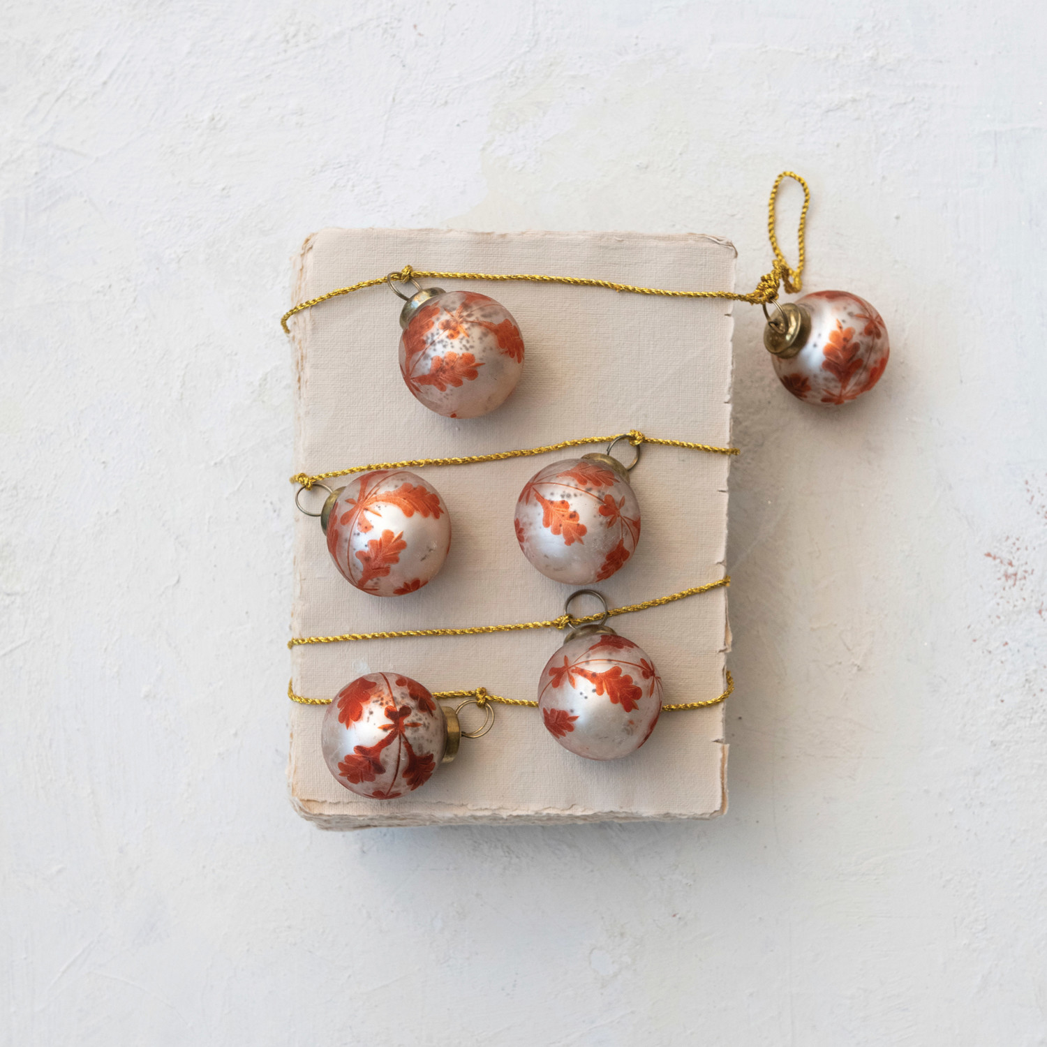 Catalog Name: 72"L x 2"H Etched Recycled Mercury Glass Ball Ornament Garland w/ Gold Cord, Matte Silver Finish & Coral Color