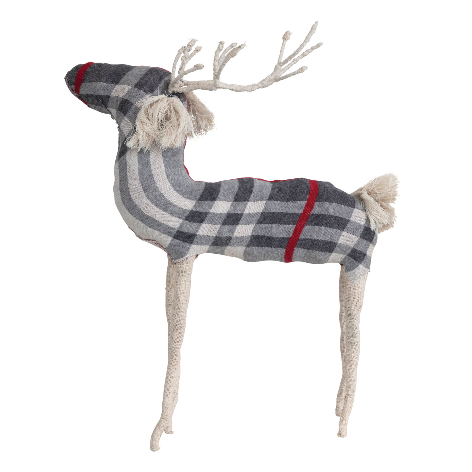 Catalog Name: 13"L x 4"W x 17"H Cotton Knit and Wire Reindeer, Cream Color, Grey and Red Plaid