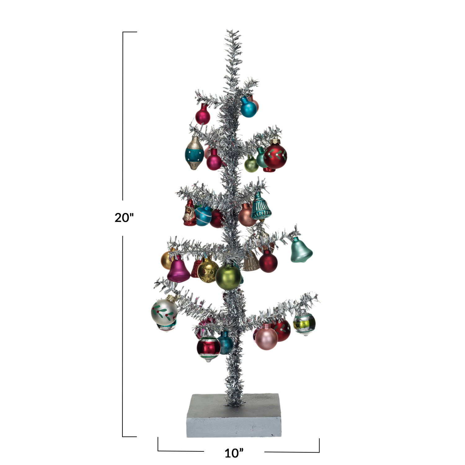 Catalog Name: 10" Round x 20"H Tinsel Tree w/ Glass Ornaments & MDF Base, Silver Finish, Multi Color