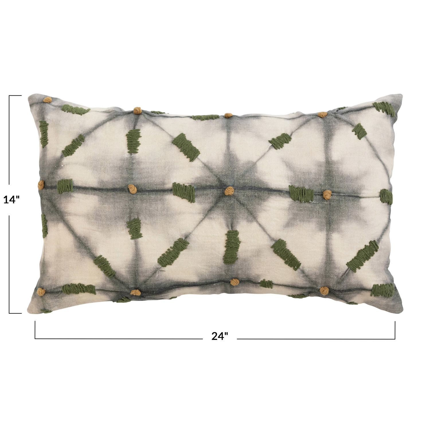 Multicolor linen lumbar pillow with tie dye print, embroidery, and chambray back. Machine Wash Warm. Prop 65 Compliant.