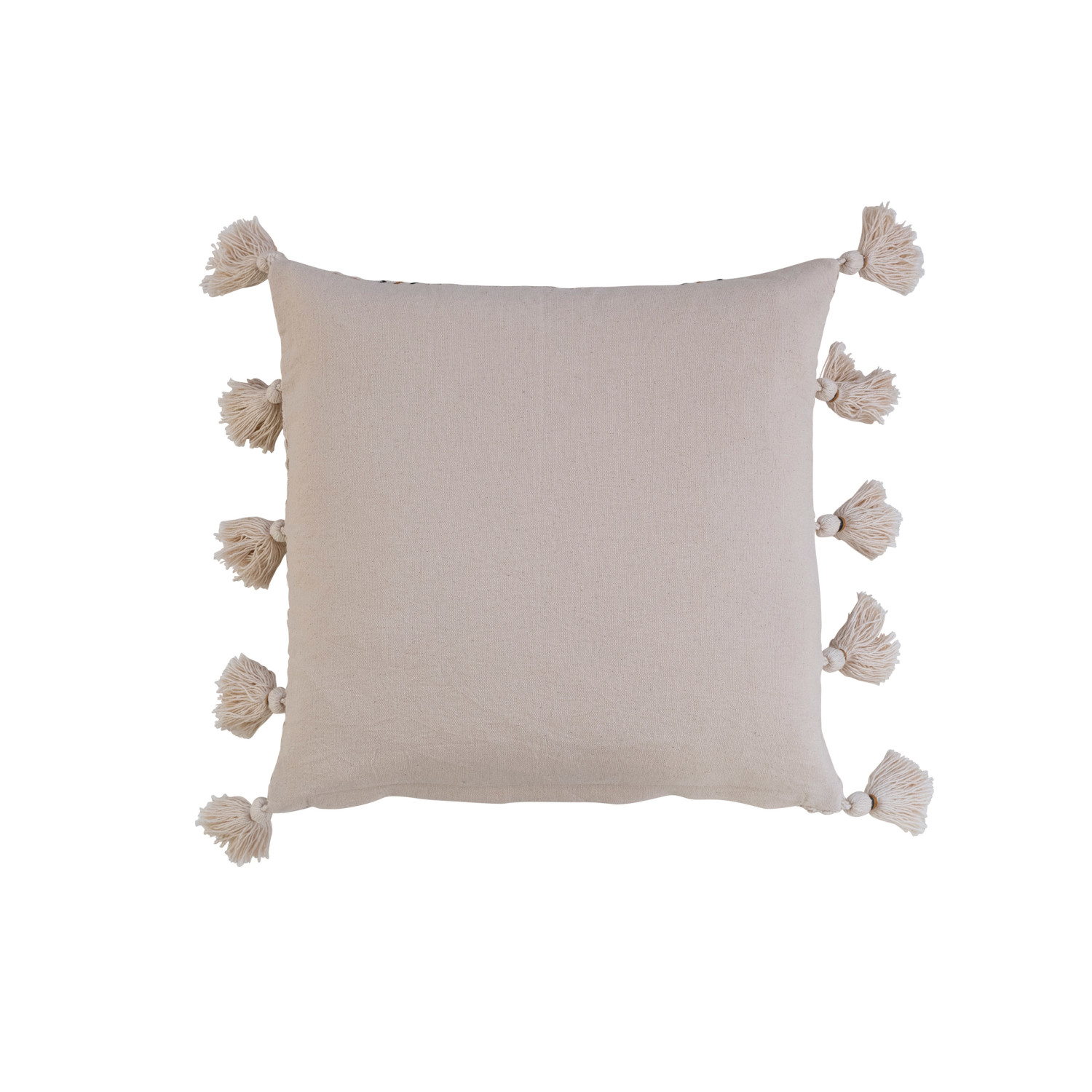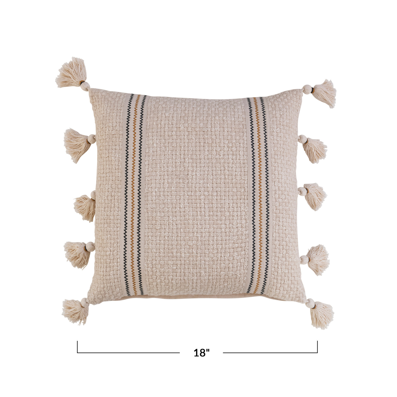 The 18-inch Square Woven Cotton Pillow has intricate embroidery and playful tassels in natural, black, and mustard colors to create a visually stunning design. This pillow is versatile for various seating areas, such as sofas, armchairs, or beds, it effortlessly complements different interior styles, including boho, eclectic, or modern farmhouse. Made from soft and durable cotton for a comfortable and cozy feel, polyester filler provides just the right amount of support for lounging or resting. The product is made of cotton with polyester filler. This pillow measures 18 inches in length and 18 inches in width. The 18-inch Square Woven Cotton Pillow has intricate embroidery and playful tassels in natural, black, and mustard colors to create a visually stunning design. This pillow is versatile for various seating areas, such as sofas, armchairs, or beds, it effortlessly complements different interior styles, including boho, eclectic, or modern farmhouse. Made from soft and durable cotton for a comfortable and cozy feel, polyester filler provides just the right amount of support for lounging or resting. The product is made of cotton with polyester filler.