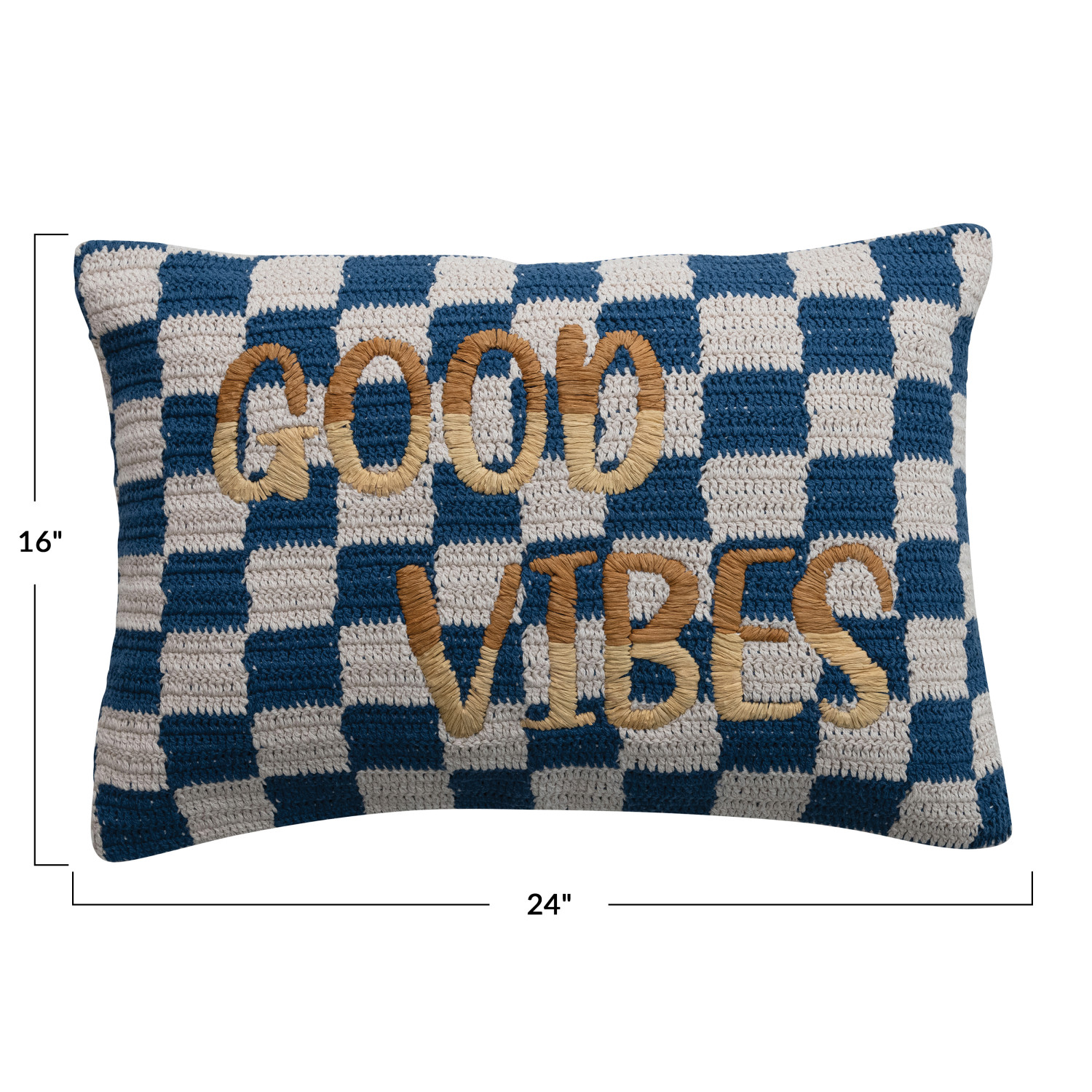 Cotton Crocheted Check Lumbar Pillow w/ Embroidered "Good Vibes"
